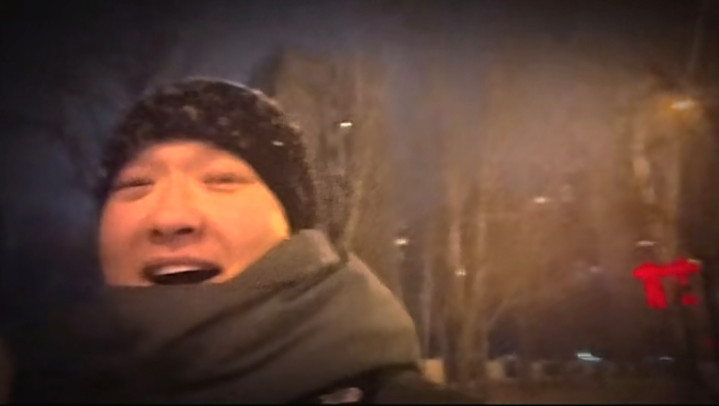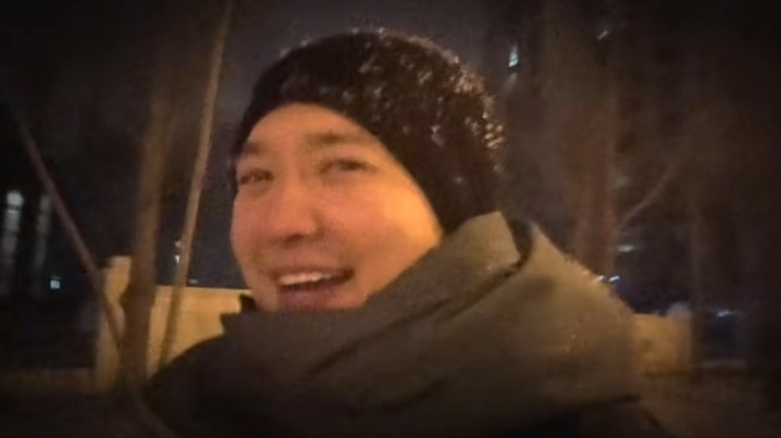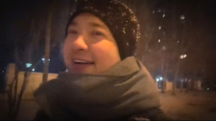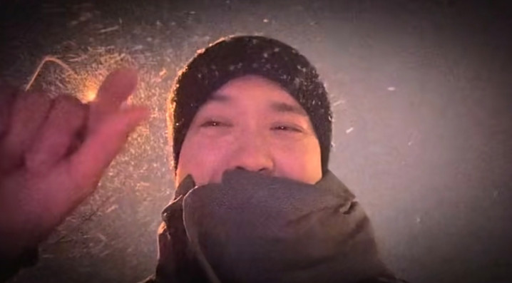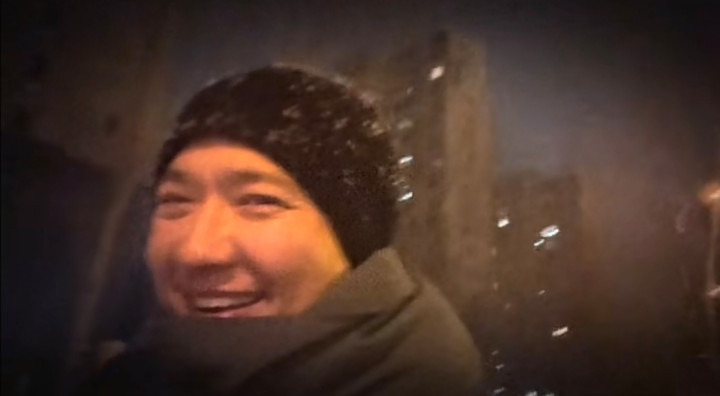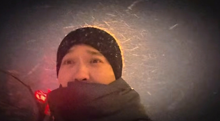 vlog显示,夜已经很深了,街灯发出昏黄的灯光,他独自一人走在街头上,只露出了肩膀以上的位置。他头戴一顶黑色的针织帽,上面堆积了不少雪花,脸上冻得通红,呼出的气都显而易见,脖子包裹得严严实实的。