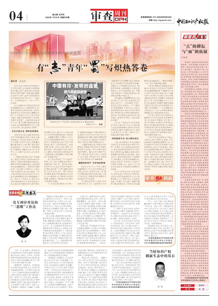 “‘智能先锋’联系人的工作既要向上及时汇报情况又要对内耐心解答疑问。”青年志愿者黄欢有感而发,她那台用坏已换新的座机,正是无数次沟通协调的见证。为落实局“智能先锋”工作部署,审协四川中心秉持“部门协同补位、线上线下推进”工作思路,组织动员近400名青年先行先试,以探路者姿态助力系统智能化升级。相关工作开展以来,累计承办1场局级宣讲活动、开展20余场中心级交流活动并编制两部实操手册和两套精品课程,覆盖中心全体审查员,为专利审查提质增效注入强劲动力。在刚刚落幕的“大模型+知识产权”应用场景创新先锋赛上,中心选送的1个创新项目从106个项目中脱颖而出,获评“十佳优秀成果”。“这场比赛不仅是一次技术比拼,更是一次理念革新。”该创新项目负责人邱川信心满满,“我们将把比赛经验应用于审查实践,让智能辅助工具真正服务于高质量审查。”