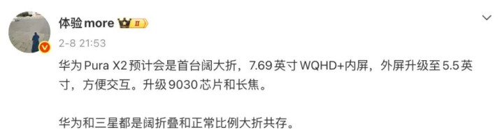 具体细节方面,博主@体验more 的爆料露馅,“华为Pura X2瞻望会是首台阔大折,7.69英寸WQHD+内屏,外屏升级至5.5英寸,方便交互。升级9030芯片和长焦。”
