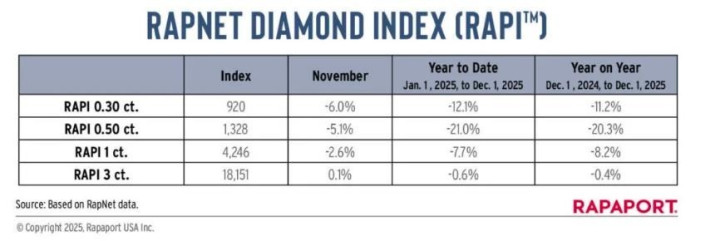 RapNet钻石价格指数(RAPI)显示,过去两年间,全球钻石价格走势呈现显著结构性分化,小克拉天然钻石价格大幅下探逾三成,大克拉高品质钻石价格相对抗跌。