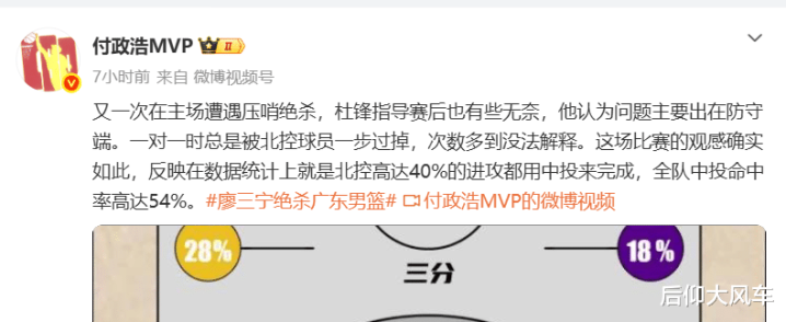 付政浩则有点同情杜指导,表示:又一次在主场遭遇压哨绝杀,杜锋指导赛后也有些无奈,他认为问题主要出在防守端。一对一时总是被北控球员一步过掉,次数多到没法解释。这场比赛的观感确实如此,反映在数据统计上就是北控高达40%的进攻都用中投来完成,全队中投命中率高达54%。