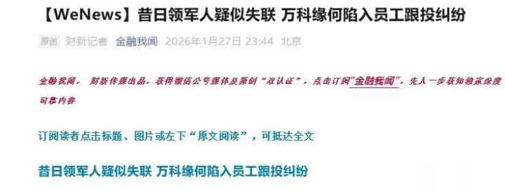 1月27日晚,财新发布了一篇《昔日领军人疑似失联 万科缘何陷入员工跟投纠纷》的报道,报道提到,万科前董事、执行副总裁郁亮于1月8日因到龄退休后,疑似已失联半月。
