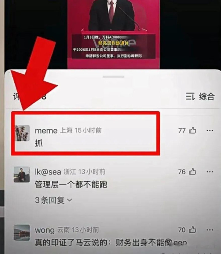 这里有个细节,就是在前不久,郁亮辞职的消息传出后,曾有一个疑似田朴珺的账号在郁亮辞职的新闻下面留言了一个“抓”字。