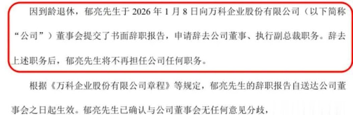 更值得关注的是退休流程的细节。财新披露,郁亮早在2025年11月就提交了退休报告,直至2026年1月初才完成流程,而这段时间恰是万科多项债务展期谈判的关键期。