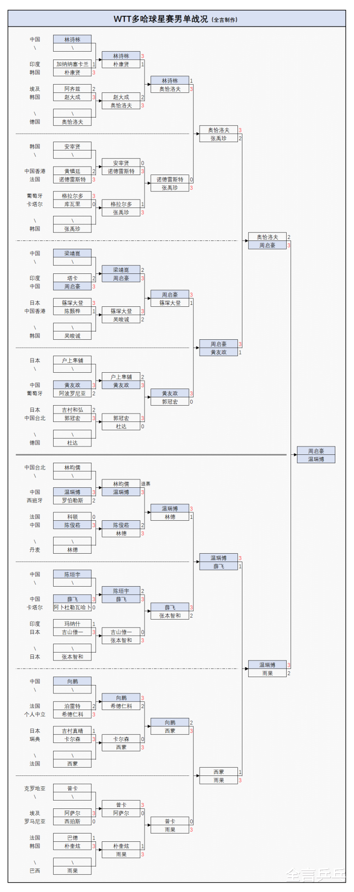 周启豪:3-2塔卡(印度)、3-2梁靖崑(中国)、3-1篠塚大登(日本)、3-1黄友政(中国)、3-2奥恰洛夫(德国);