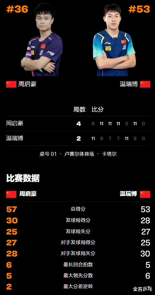 本站比赛两位选手都有经历打满5局的恶战,淘汰了多位强敌,赢得并不轻松,其中周启豪气势如虹打败3位世界冠军,包括队友梁靖崑、日本的篠塚大登、德国的奥恰洛夫,温瑞博也爆冷拿下了巴西世界冠军雨果等强敌,决赛之战胜负难料。