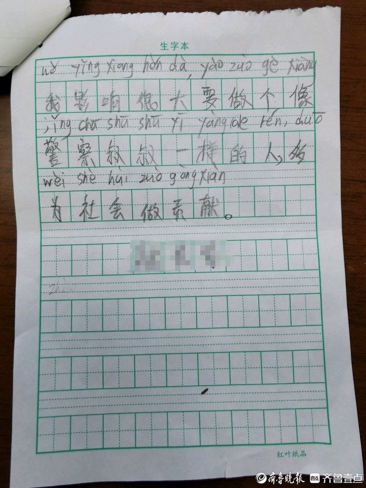 近日,济南公安轨交分局位里庄派出所收到了一封特殊的感谢信——由拼音与汉字共同写成,来自一位刚上一年级的小学生。信中,这名小学生认真写道:“这件事对我影响很大,我长大要做个像警察叔叔一样的人,多为社会做贡献。”